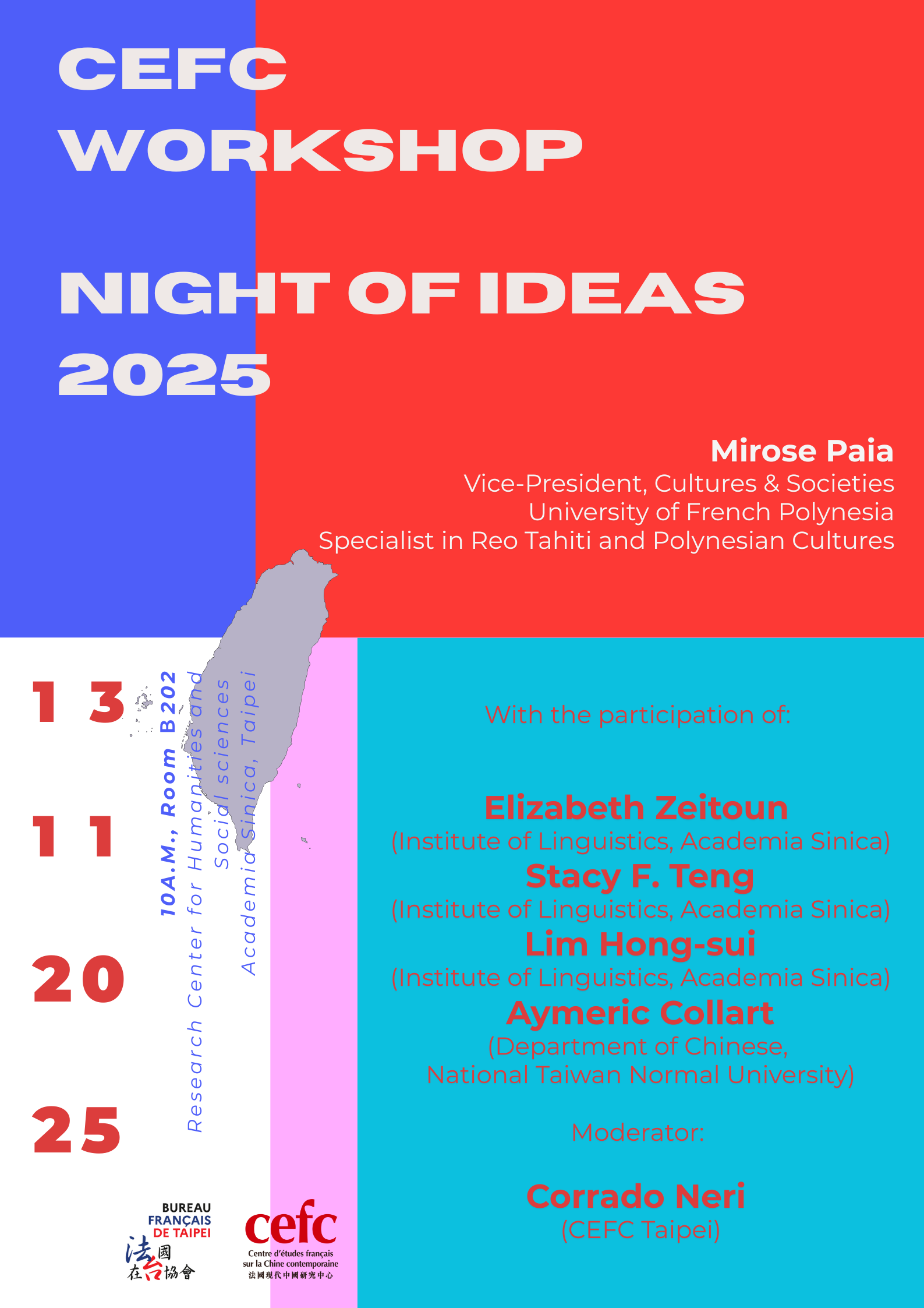 The workshop aims to foster dialogue with Academia Sinica and other Taiwanese institutions on potential scientific collaborations between Taiwan and French Polynesia, especially in the fields of cultural, linguistic, and heritage studies.