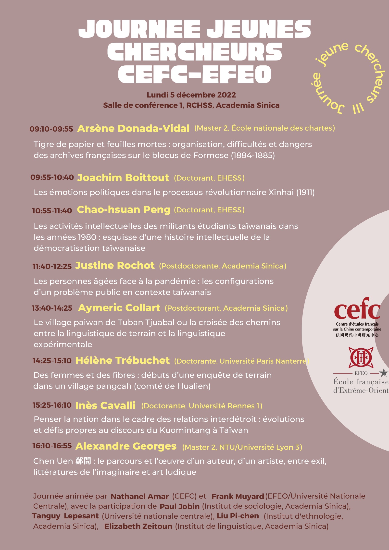 Avec la participation de Paul Jobin (Institut de sociologie, Academia Sinica), Tanguy Lepesant (Université nationale centrale), Liu Pi-chen (Institut d’ethnologie, Academia Sinica), Elizabeth Zeitoun (Institut de linguistique Academia Sinica).