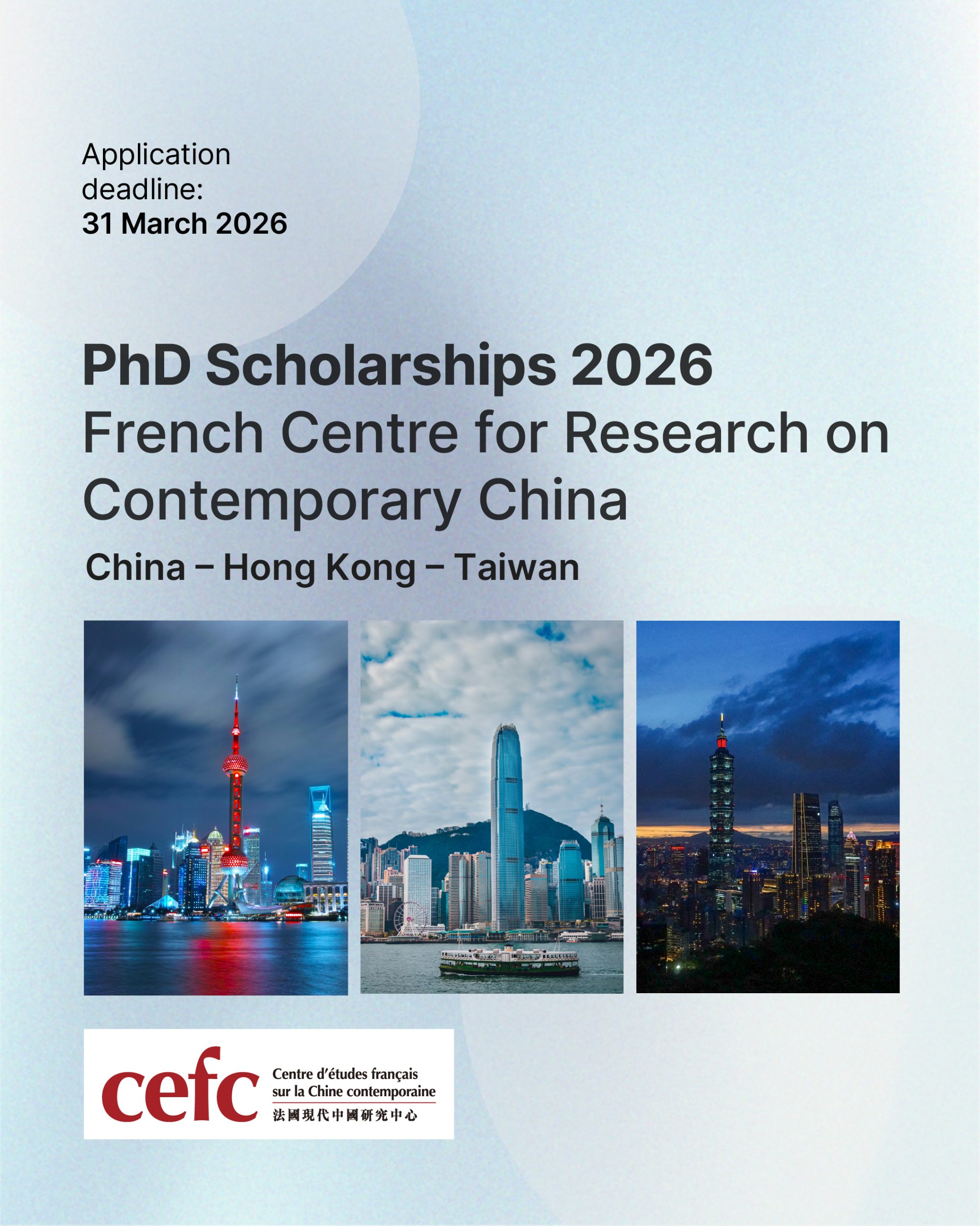 In 2026, the French Centre for Research on Contemporary China (CEFC) will award scholarships for doctoral students, for field research in China, Hong Kong, or Taiwan. It is primarily intended to support data collection work in the geographical area covered by the CEFC (Mainland China, Taiwan, Hong Kong, Macau).